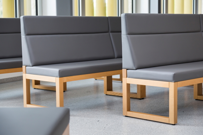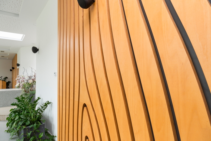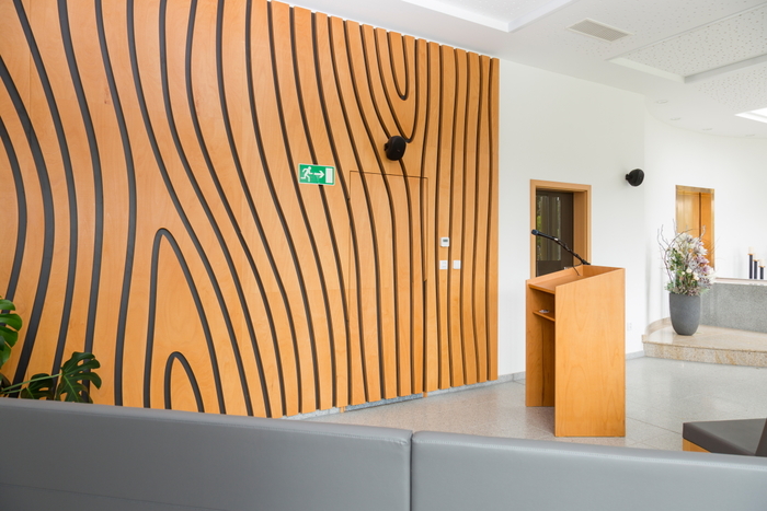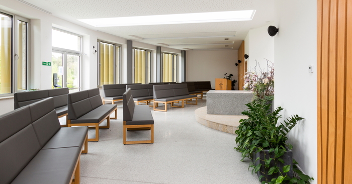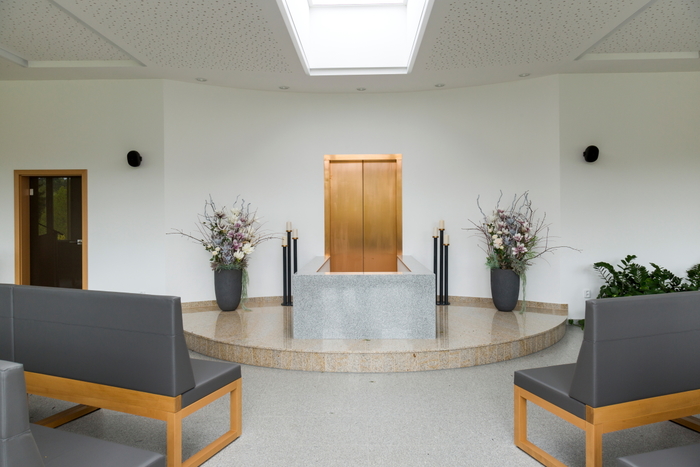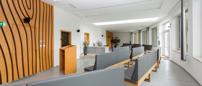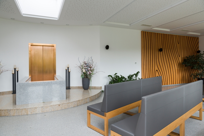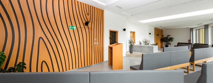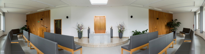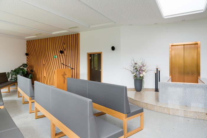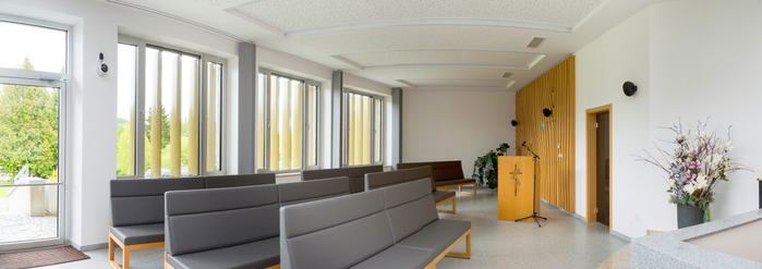 Smuteční síň ve Vyšším Brodě s dřevěným obkladem stěny,